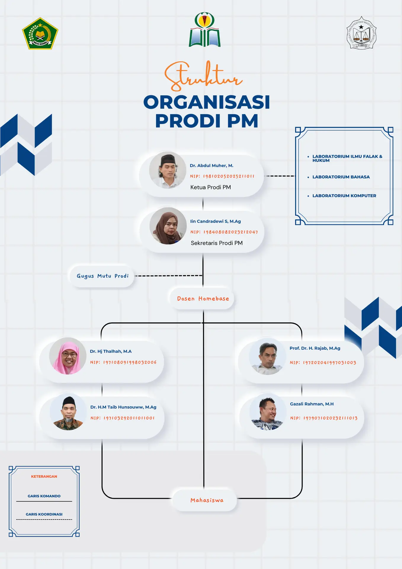 Struktur Organisasi Prodi Perbandingan Mazhab yang terdiri atas Ketua Prodi, Sekretaris Prodi, Dosen Homebase, dan Mahasiswa dirancang secara profesional dan terintegrasi untuk memastikan tata kelola akademik yang efektif, kolaboratif, dan berorientasi mutu. Melalui kepemimpinan yang visioner serta sinergi seluruh unsur akademik, Prodi PM berkomitmen menghadirkan lingkungan pendidikan yang unggul, adaptif, dan responsif terhadap perkembangan keilmuan.